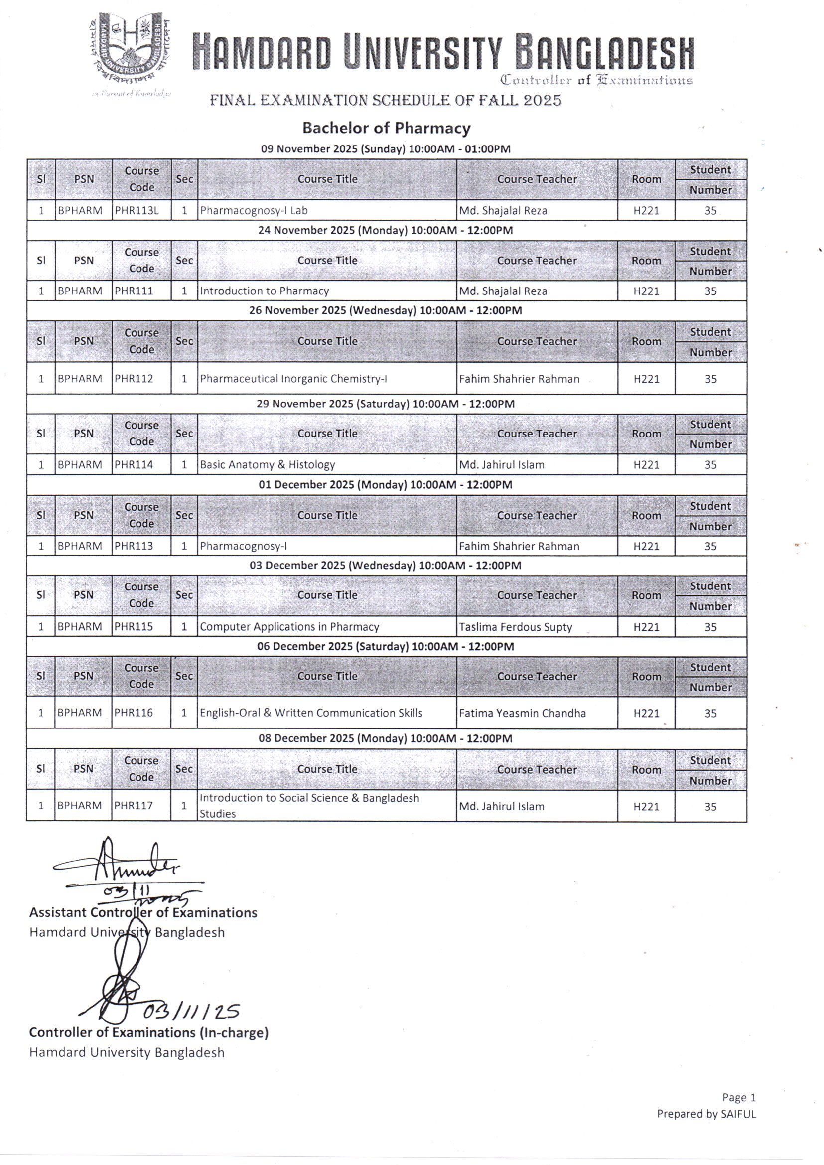 Final Examination Schedule of Fall 2025