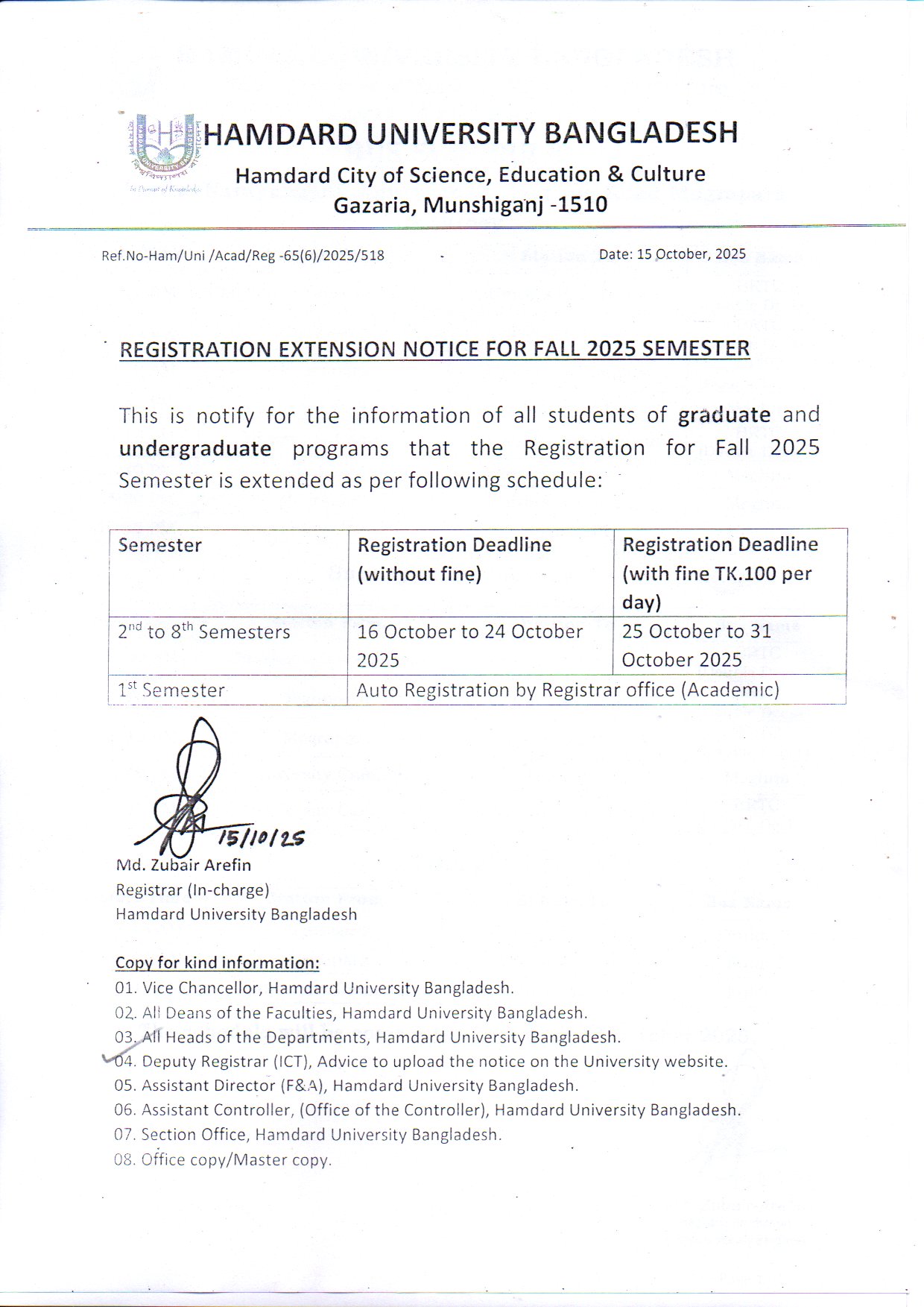 Registration Extension Notice for Fall 2025 Semester