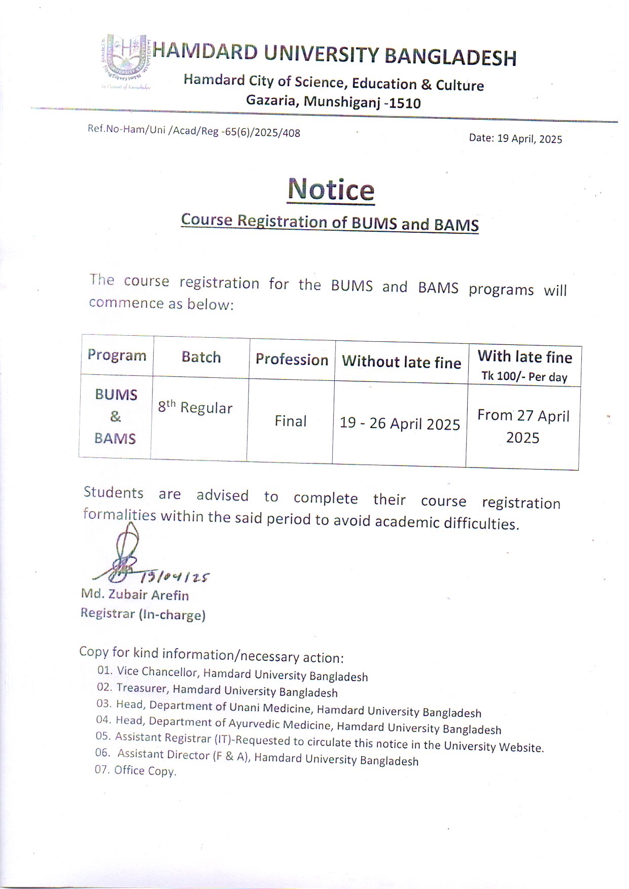 Notice: Course Registration of BUMS and BAMS